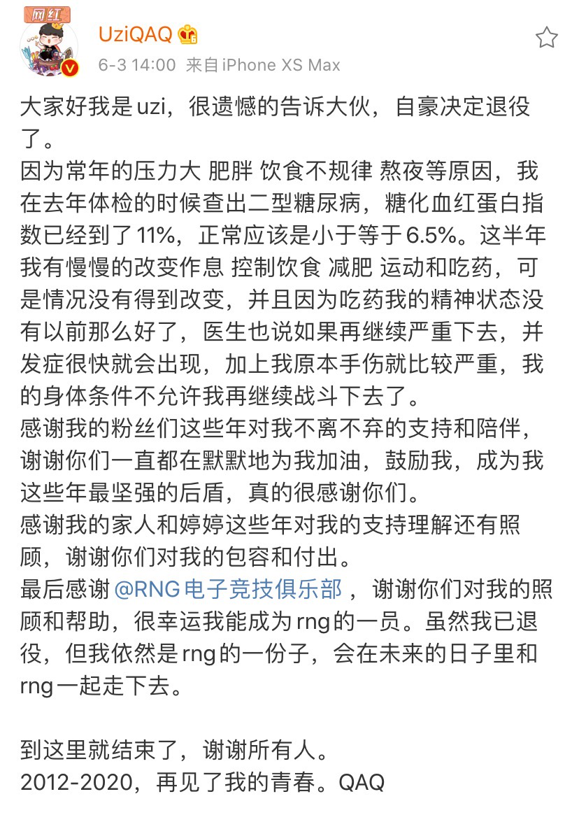 尽管有所预兆,可当“退役”二字真真切切,出现在Uzi微博上的时候,还是有些刺眼。