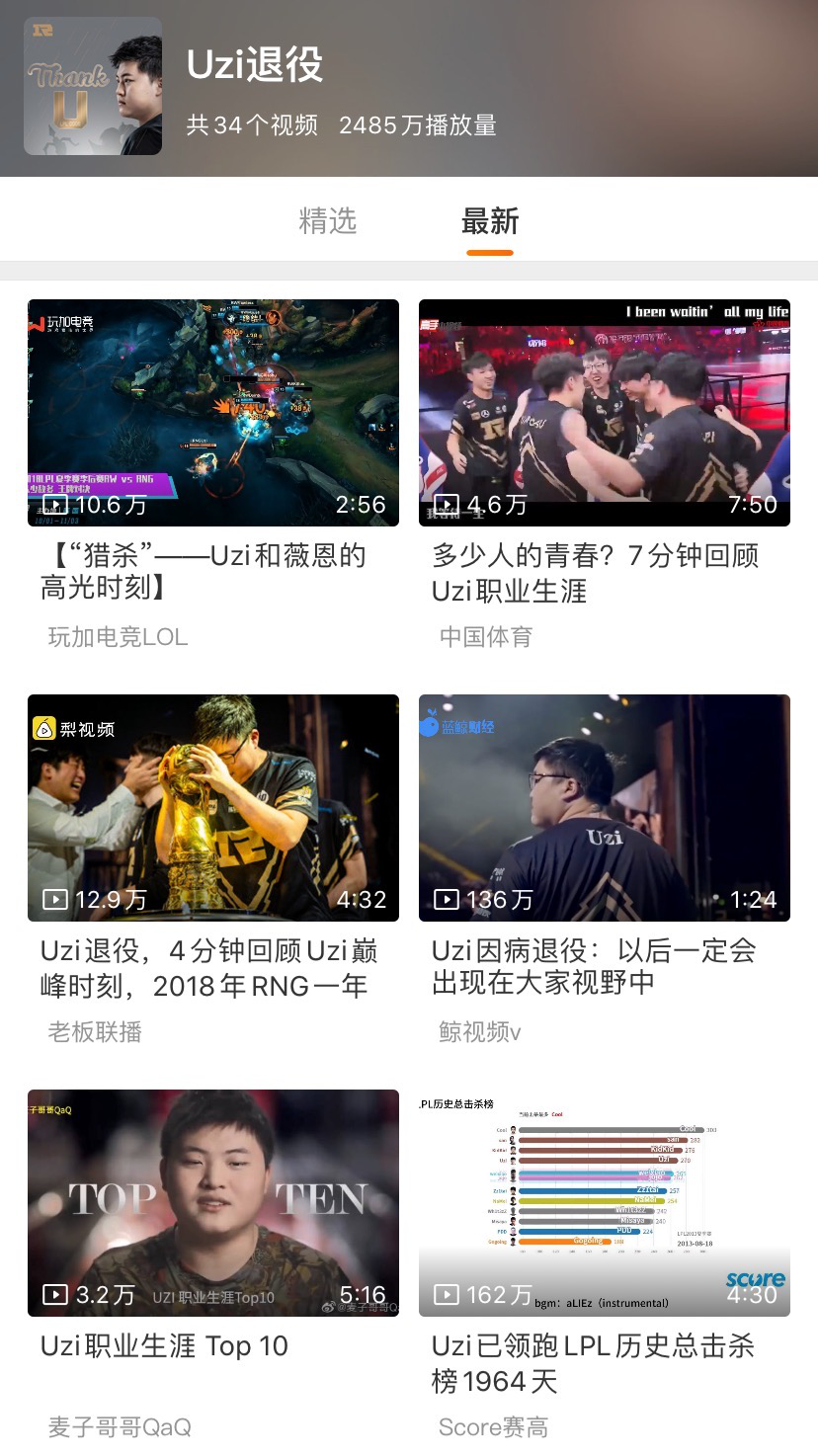 没过一分钟,“Uzi退役”的词条冲上热搜,热评里聚集了好些名人,他从前的队友、对手,各大俱乐部,解说……而各大平台的相同话题下,“Uzi生涯回顾”“Uzi职业高光”等视频也骤然涌出。