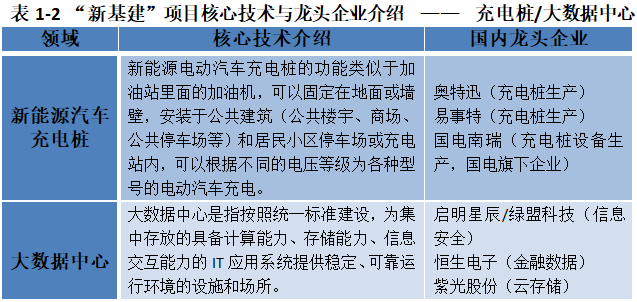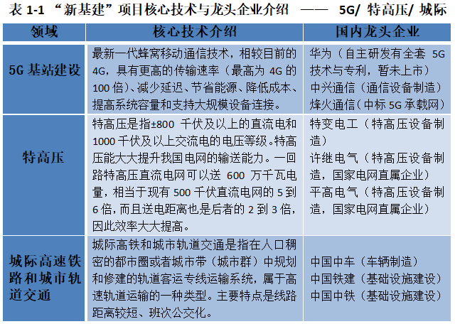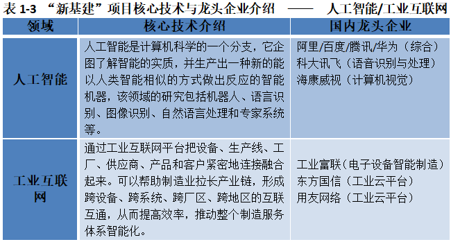 关于“新基建”各领域核心技术,以及国内龙头企业的情况总结如下表: