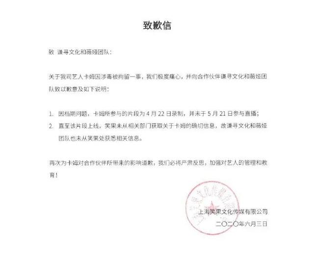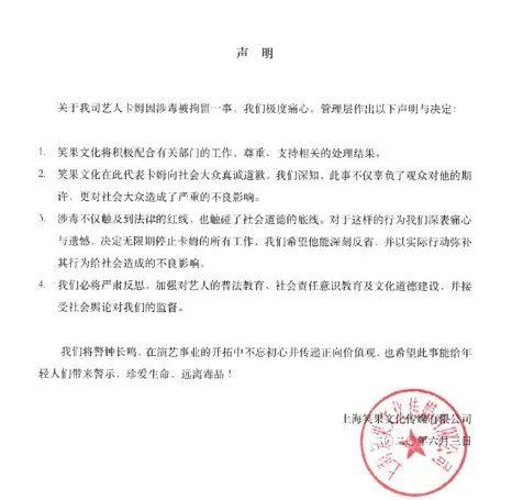 正可谓一波未平,一波又起。池子与笑果之间的纷争尚未有定论,笑果旗下的另一知名艺人卡姆被爆因吸毒被行政拘留。消息一经流出迅速引发热议,在网友翻出上海虹口公安5月1日的通报后,笑果发布声明确认此事,并称决定无限期停止卡姆所有工作。在这份声明中并没有提及笑果文化与卡姆解约,这也意味着目前卡姆依然是笑果文化旗下艺人之一。