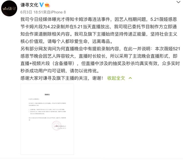 与此同时,卡姆也将笑果文化又一次推在舆论的风口浪尖上。细心的网友发现, 在卡姆事发后,仍然参与了“521薇娅感恩节”直播活动,在活动的前期宣传中也有卡姆的身影。不少网友质疑:“如果没有爆料,笑果文化是否当作‘没事人’继续欺骗观众?”针对这一质疑,笑果文化向薇娅公司谦寻文化以及团队致歉,声称卡姆片段为录播,并且在上线时并不知道卡姆确切信息。
