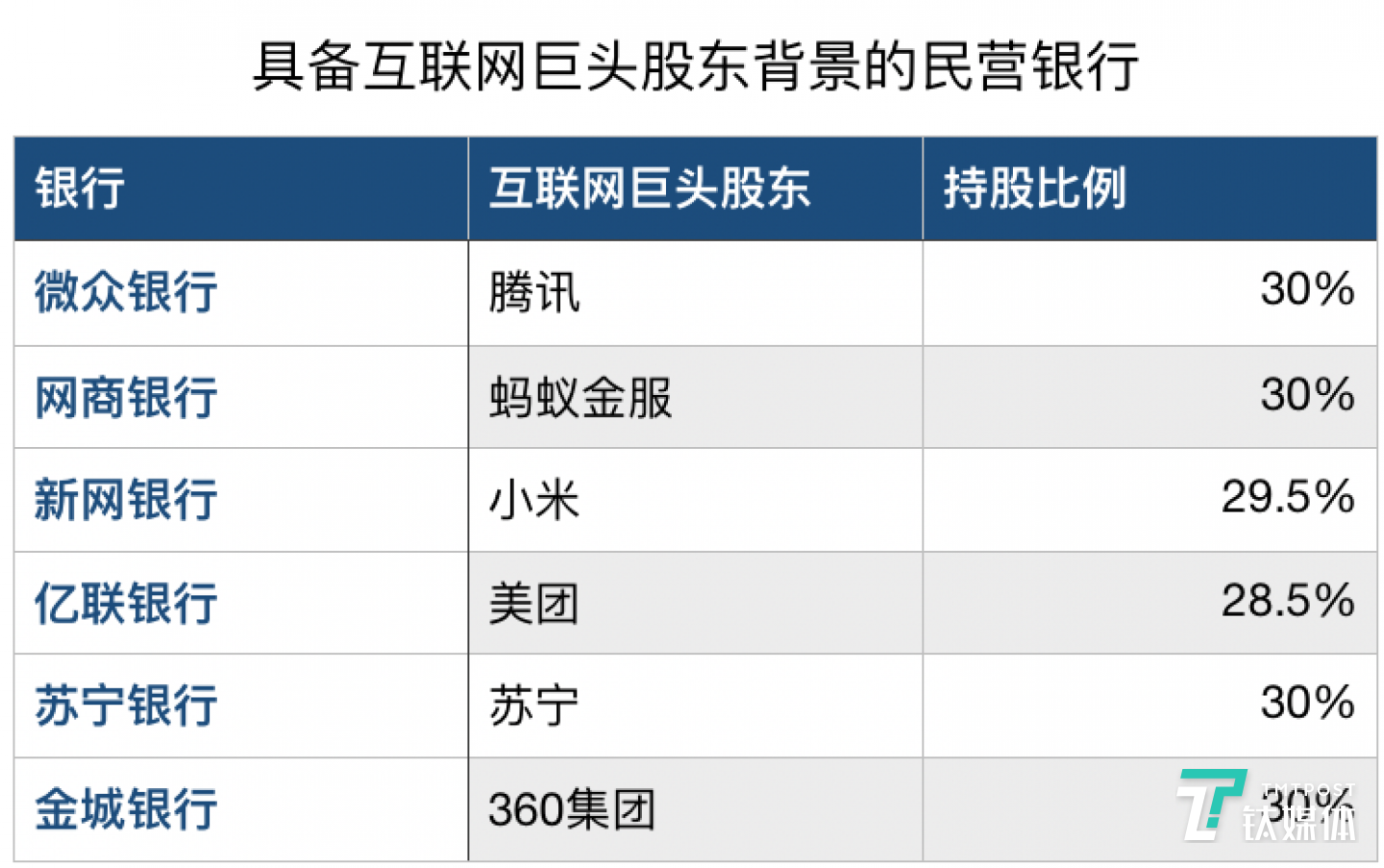 值得注意的事,股权比例限制导致了各家互联网巨头入股民营银行均在30%以下——对于民营银行,银监会确定单一股东持股比例上限为30%,以避免单一股东一股独大。