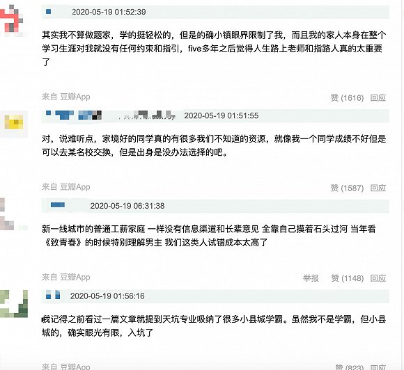 在另一篇文章里,作者回溯了自己从高中到工作的经历,她从边远省份以小城状元身份考入一所沿海地区的大学,曾在繁难的课业与文化冲击中陷入自我怀疑;她劝慰有同样情况的人在时运不济时不要过度责备自己,更重要的是,以后也可以不去责备别人身陷窘境“是因为他们不够努力”,因为过往的经历让她认识到,个人奋斗固然重要,但还有更多原因能够决定一个人的成败。事实上,早在豆瓣“985废物引进计划小组”之前,百度“985贴吧”中就已经频现类似的个人故事与落差感叹。