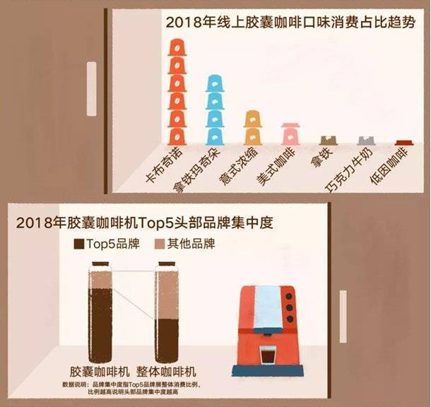 CBNData发布《2019年线上咖啡行业趋势洞察》显示,胶囊咖啡机销售在TOP5品牌中占比很大。