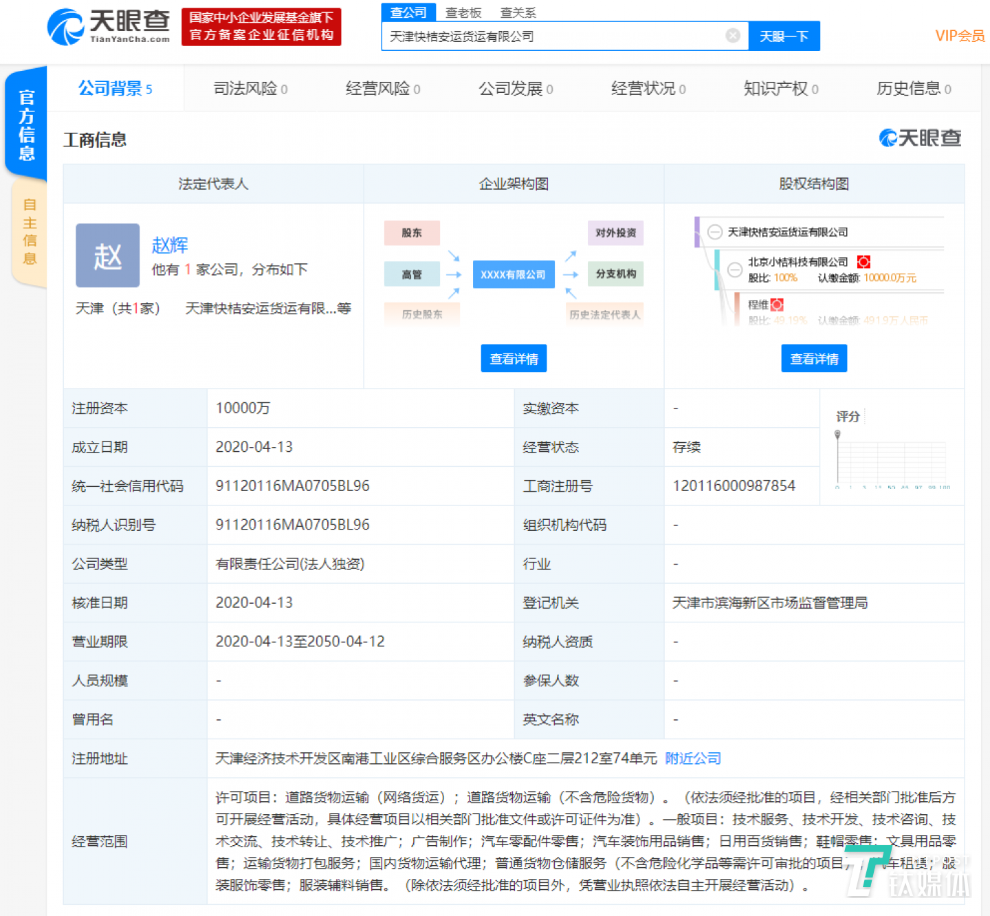 天眼查数据显示,今年4月13日,天津快桔安运货运有限公司成立,注册资本1亿人民币,法定代表人为滴滴代驾事业部总经理赵辉,公司经营范围包括道路货物运输(网络货运)、道路货物运输(不含危险货物)等,该公司由滴滴出行的关联公司北京小桔科技有限公司全资持股,后者的最大股东为滴滴出行创始人兼CEO程维,持股比例49.19%。