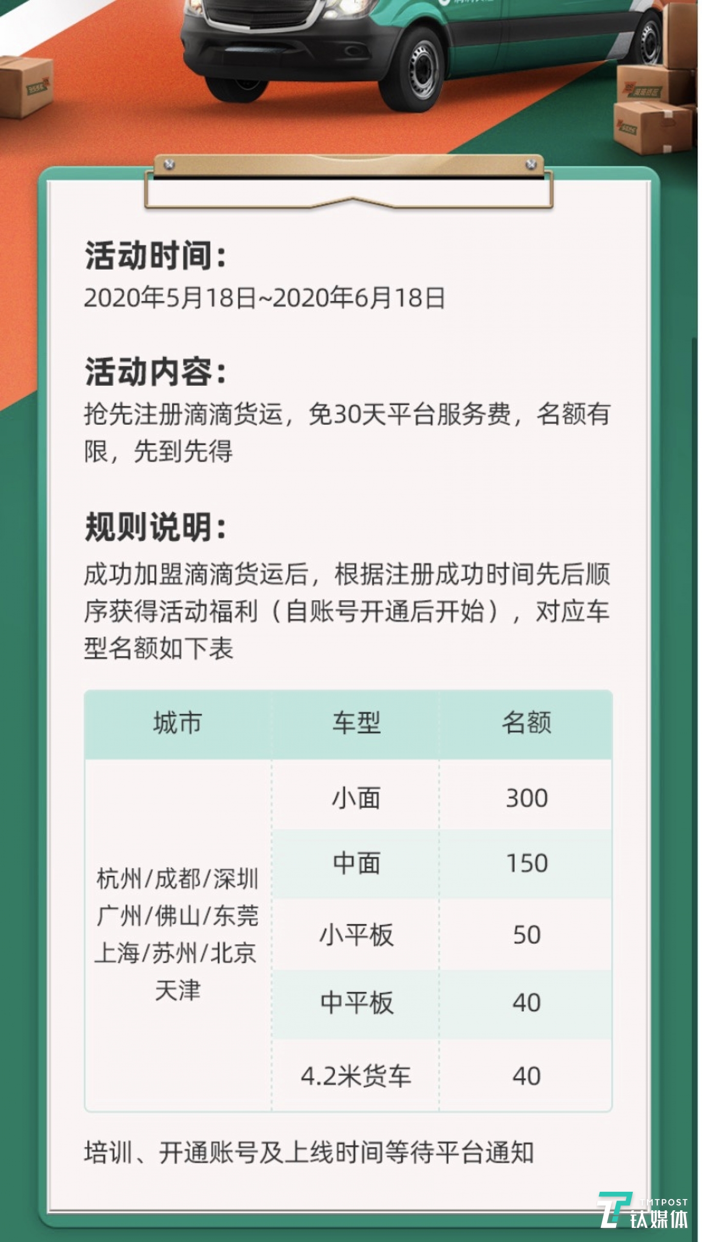不过滴滴在活动规则中强调称,城市打call排行榜结果与滴滴货运实际开城顺序无关,具体开通城市需要以平台后续公布的信息为准。