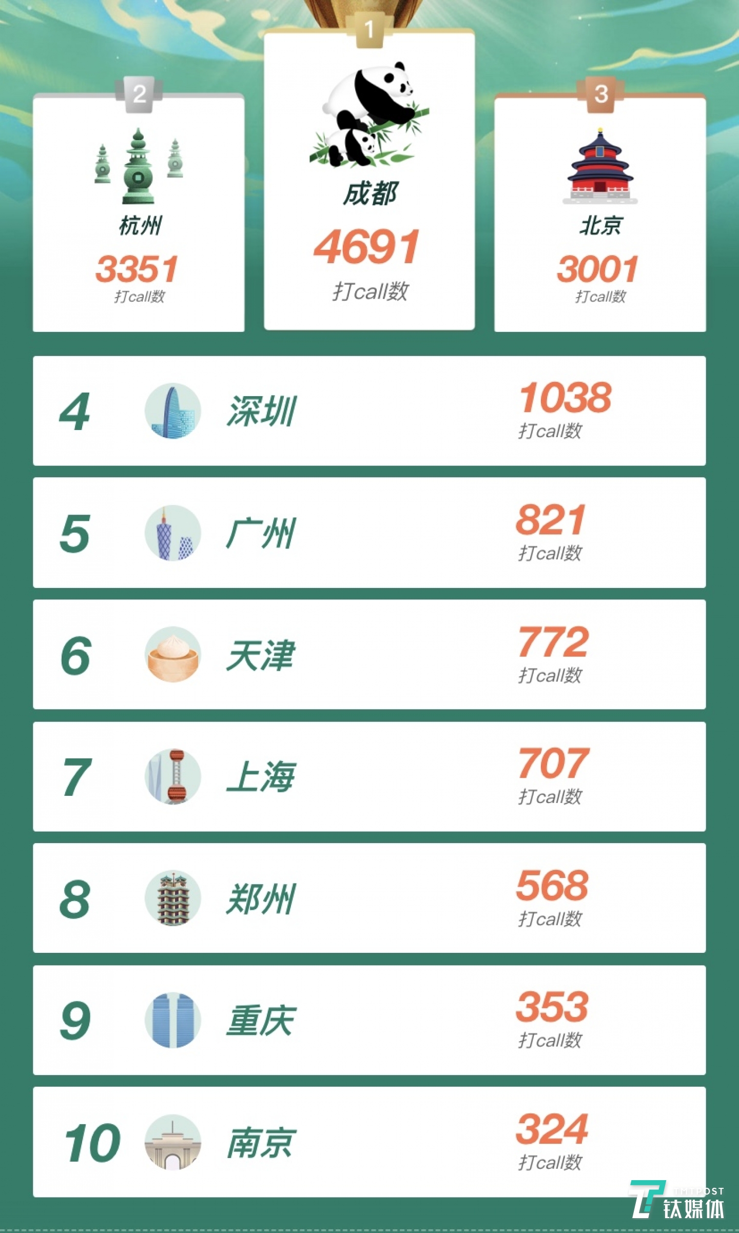 截止到钛媒体发稿,打call榜排名为成都、杭州、北京、深圳、广州天津、上海、郑州、重庆、南京。