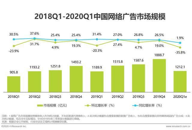 2020年Q1趣头条财报中最大的亮点是广告业务的增长。在疫情影响下,各大平台的广告业务都或多或少出现影响,而2020年一度被市场称为“中国互联网广告最难的一年”。根据艾瑞数据,2019年Q4到2020年Q1,互联网广告市场规模从1888.7亿下滑到1212.1亿,环比下跌35.8%,较2019 Q1同比增加1.9%。