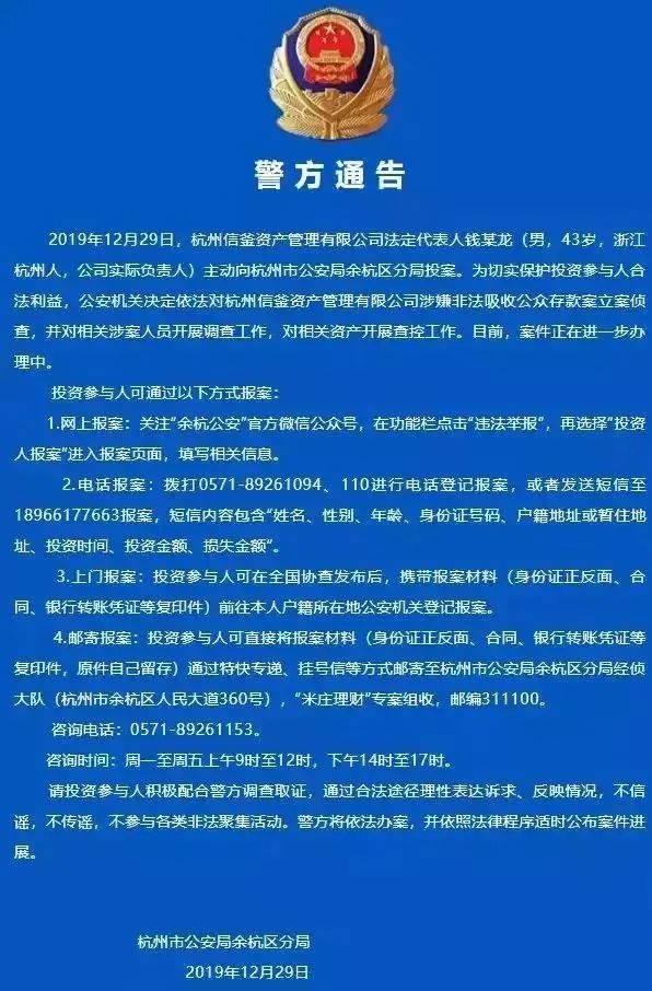 2019年12月29日,杭州市公安局余杭分局发布通报,杭州信釜资产管理有限公司法定代表人钱某龙(男,43岁,浙江杭州人,公司实际负责人)主动向杭州市公安局余杭分局投案,公安机关决定对杭州信釜资产管理有限公司非法吸收公众存款案立案调查。