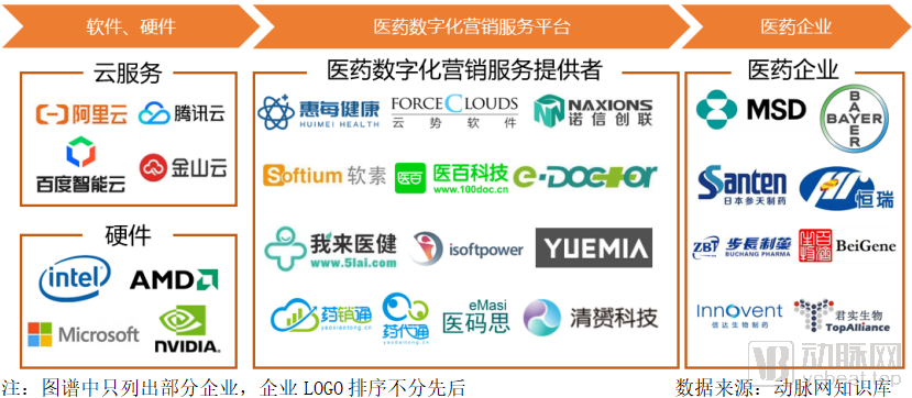 医药数字化营销服务的支持者:主要包括软件服务商和硬件供应商。软件服务商主要包括云服务提供商、IT技术提供商等,为企业提供搭建服务平台的技术支持;硬件服务商主要包括计算机、服务器等设备的供应商。