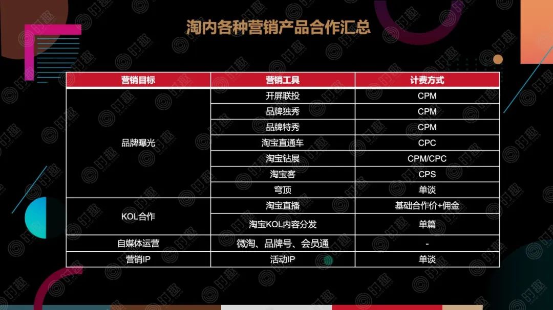 我们以淘宝为例,淘宝平台的主要营销方法有四大类:硬广合作、KOL合作、自运营矩阵、营销IP矩阵。不同营销品类下又会有具体的营销工具使用。