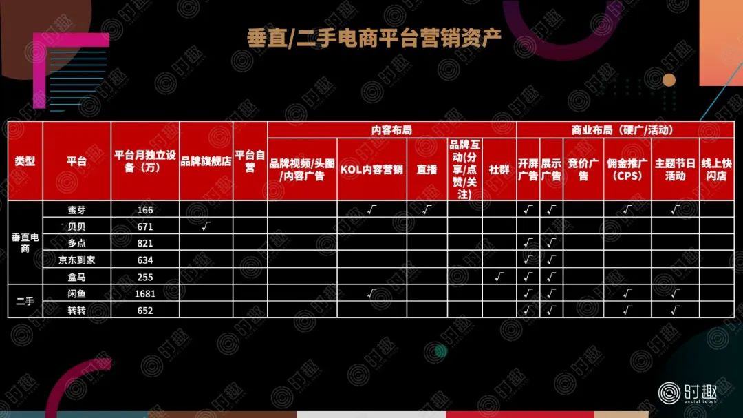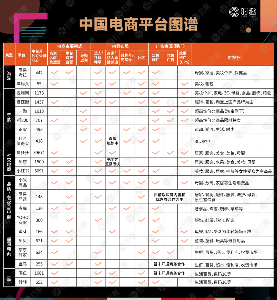 由于品类及客群的分化,不同平台的定位、玩法都不相同。时趣对目前主流的28个电商平台进行了相关梳理,以便品牌方选择匹配的电商平台进行营销。