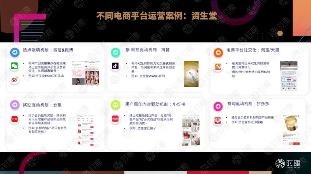 不同平台的营销逻辑不同,我们可以拿资生堂的电商营销来举例:在双微平台中品牌主要做热点内容吸流量,抖音上主要进行意见领袖的品牌驱动,淘宝/天猫上则在尝试KOL社交化推荐,小红书则是产品功能种草,拼多多上采用拼购玩法,云集上则主打奖励驱动的电商转化。