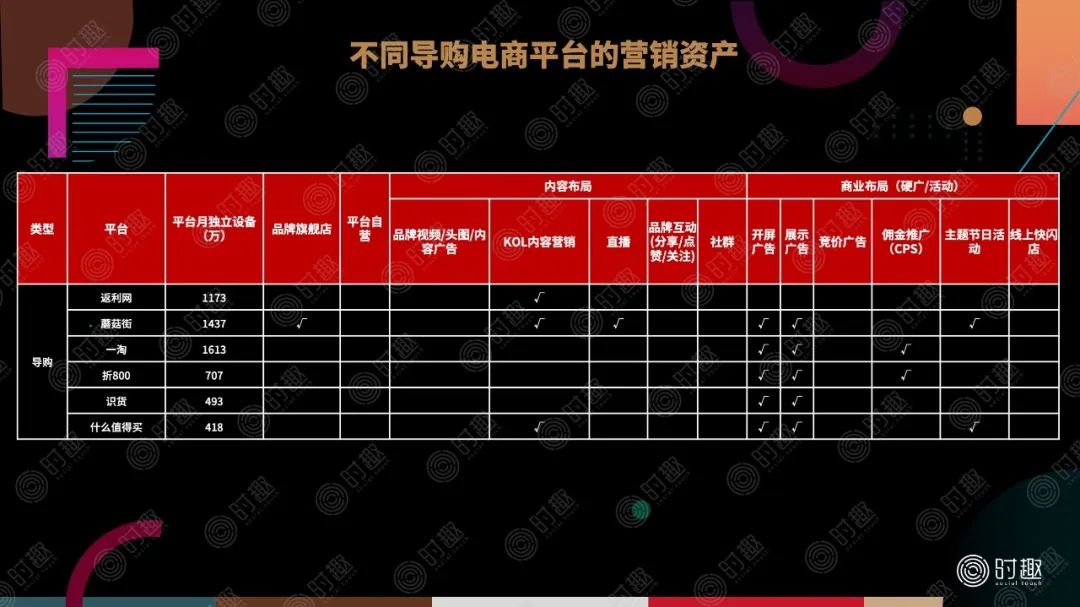 常见的导购型电商主要有什么值得买、返利网、蘑菇街、一淘、折800、识货等平台,相比于综合性电商平台,导购电商的营销工具选择更偏向于内容端。