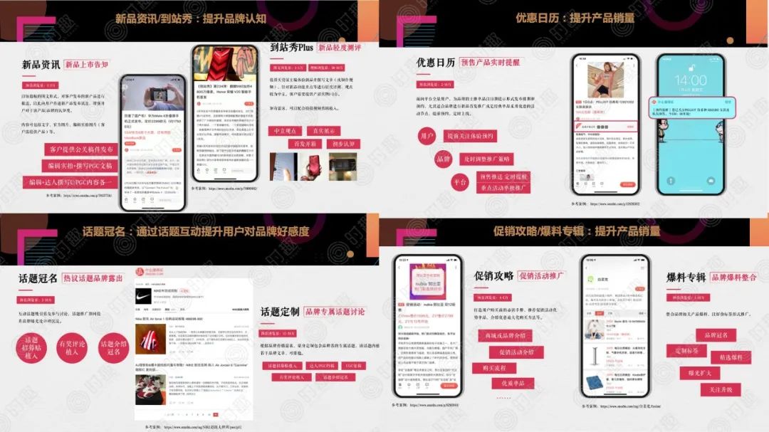 我们以什么值得买为例,品牌方可以通过新品资讯/到站秀、话题冠名、促销攻略/爆料专辑、优惠日历,以及达人评测的方式进行内容定向投放合作。