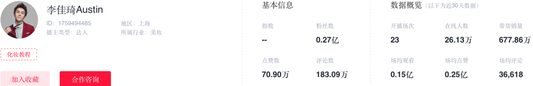 “李佳琦至今还专注在美妆领域,但这一垂类的品牌有限,而且美妆产品的消费频次没有服饰、日化、美食那么高,李佳琦其实现在快要接近自己流量的波谷了。”王盛称。
