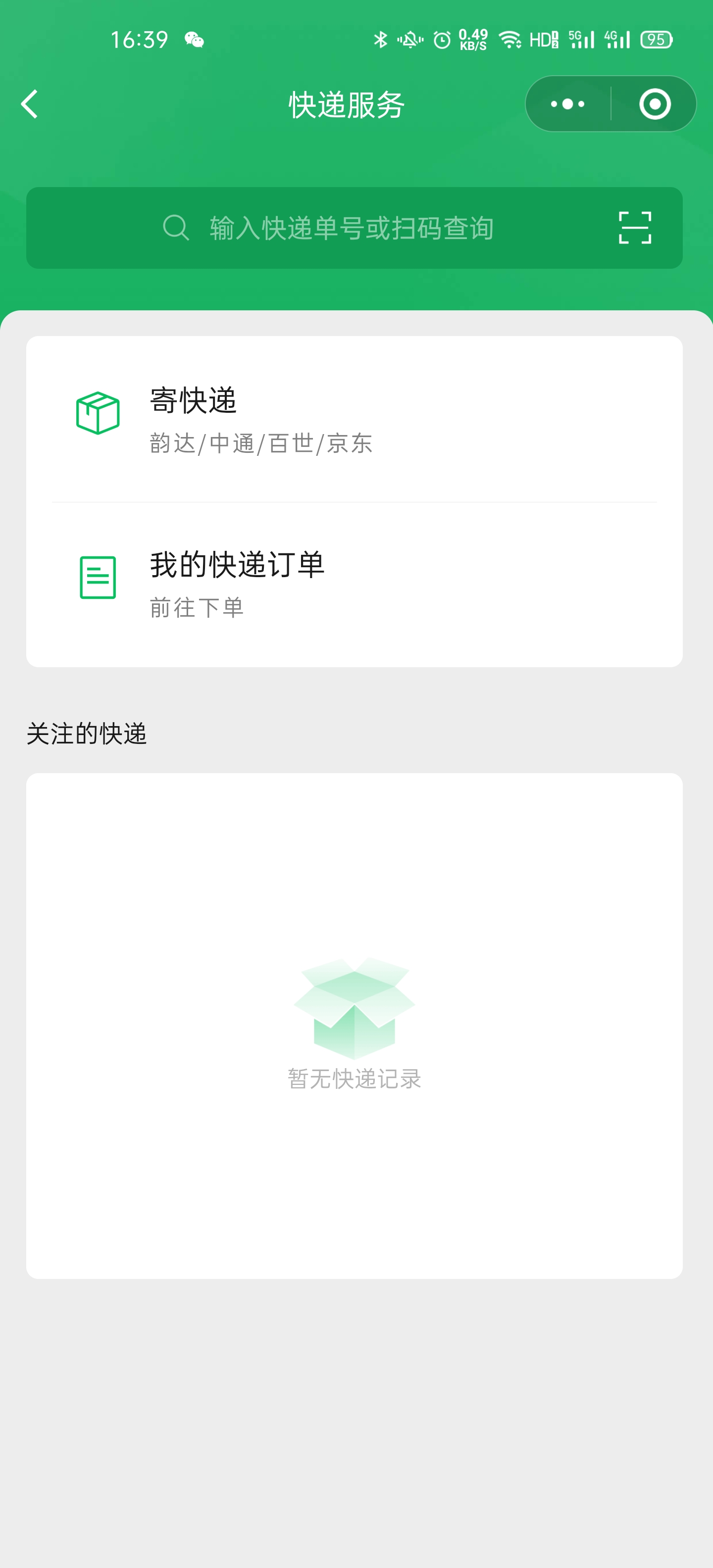 微信寄快递这个小程序的主界面非常简洁,可以分为两大区域,分别是功能区和信息展示区。另外,小程序主页顶部有搜索栏和二维码扫码工具,可以快速地找到订单的信息,系统会自动识别物流公司,还算比较方便。