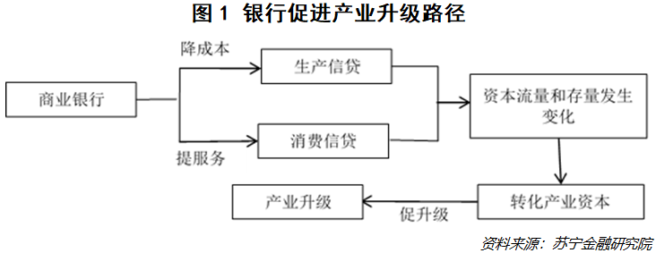 以银行的信贷产品为例,银行通过加大对企业(生产)和消费者(消费)的信贷支持,影响储蓄和投资,进而带动资本流量和存量的变化,改变生产要素的分配结构,影响资本的供给和配置,最终助推产业结构的升级调整(见图1)。