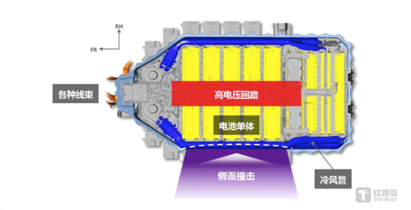 其次,为了防止电池包在受到强大撞击时起火,车辆的高压电回路被设置在了电池包中央,并用冷风管将电池包包围起来。确保车辆侧面受到撞击时,冷风管可以起到缓冲作用,能够有效降低起火的风险。