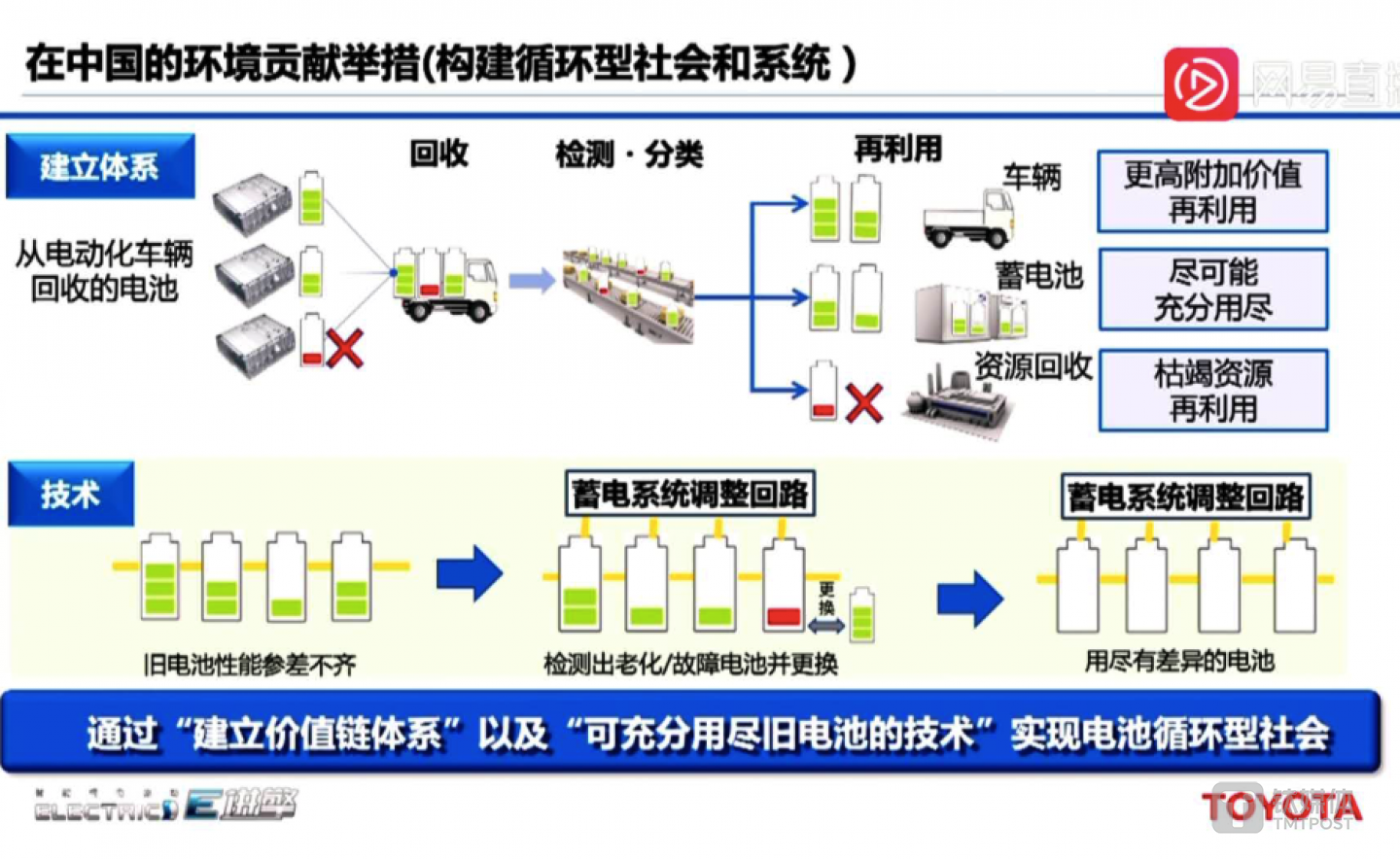 在丰田技术空间分享会上,丰田对外表示,将在中国布局电池回收业务。通过检测、回收、再利用等多个环节"建立价值链体系",以及"可充分用尽就电池技术"实现电池循环社会。