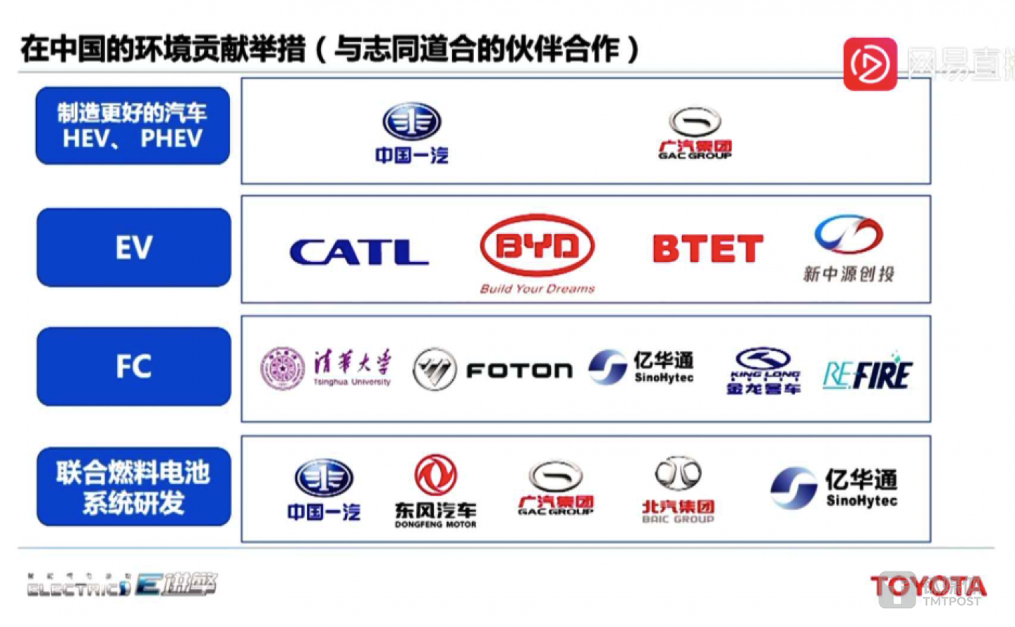 例如HEV与PHEV车型,丰田将于中国一汽和广汽集团扩大合作范围,推出更多不同车型产品。而EV车型,则会加强上下游厂商合作,例如比亚迪、宁德时代以及新中源创投等。