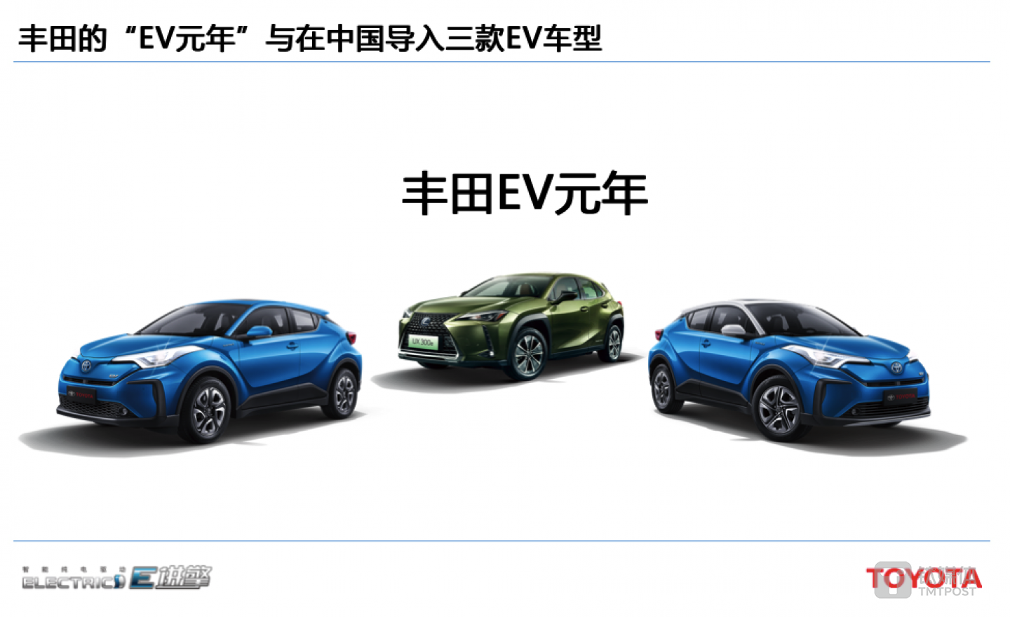 在2020年中,丰田旗下C-HR EV/奕泽 E进擎和雷克萨斯品牌量产纯电动车型UX 300e作为排头兵率先进入中国市场。
