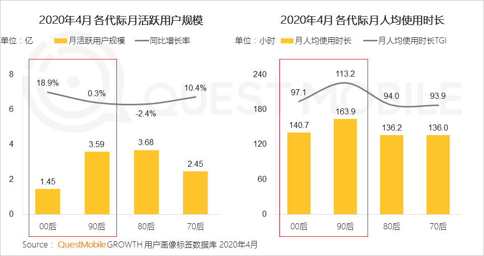 这背后,本质是流量的玩儿法:代际用户对于去中心化的信息平台使用稳步增长,2020年4月,用户规模上,00后同比大幅增长18.9%,达到1.45亿,90后微涨0.3%达到3.59亿,这两部分群体数量正不断逼近80后、70后;月人均时长,90后时长TGI为113.2、00后时长TGI为97.1,均已经超过了80后、70后。