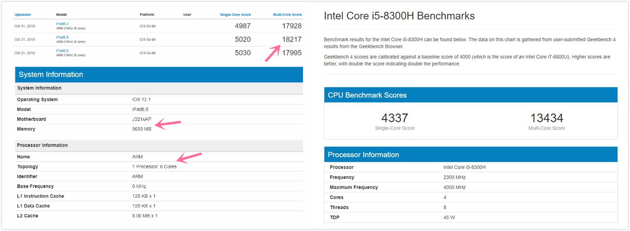 在当时,苹果官方表示A12X超越92%便携式PC的性能。从GeekBench 4.3测得的数据可以看出,苹果并没有说谎,A12X单核5030分,多核18217分,而英特尔标压的i5-8300H单核只有4337分,多核13434分。