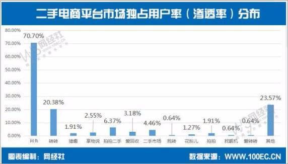 《2018年度中国二手电商发展报告》显示,闲鱼渗透份额占比70.7%,而排名第二的转转占比仅为20.38%。