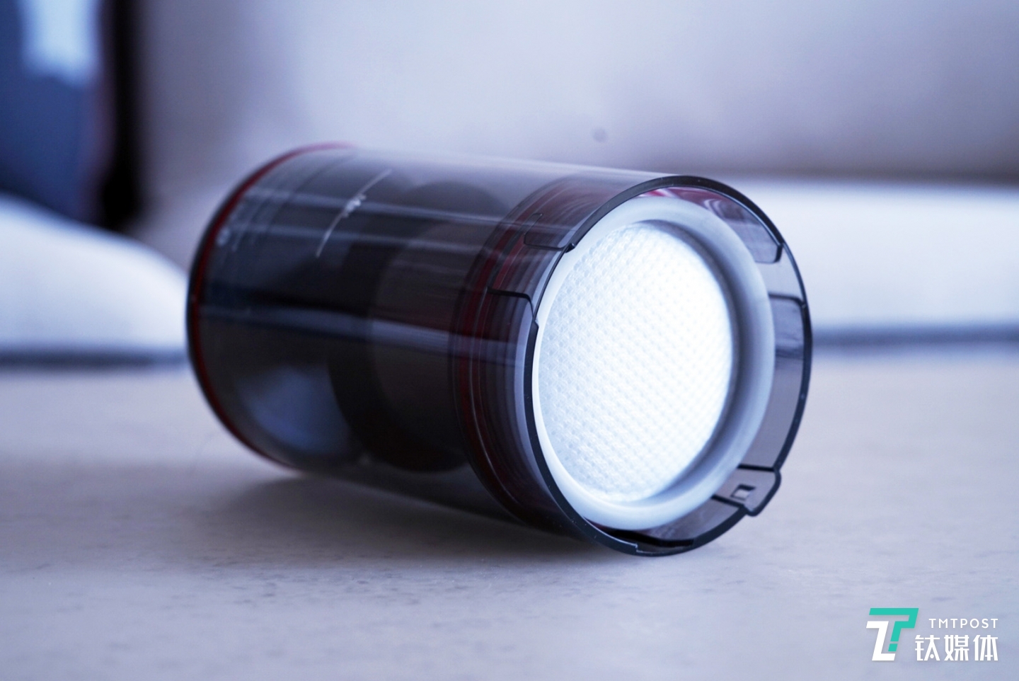 在这方面它还用到一个多锥选封锁尘技术,强大的离心力让大颗粒灰尘甩到尘杯的底部,把微尘甩到尘桶四周,因此风道便不会拥堵,更好的排出灰尘。