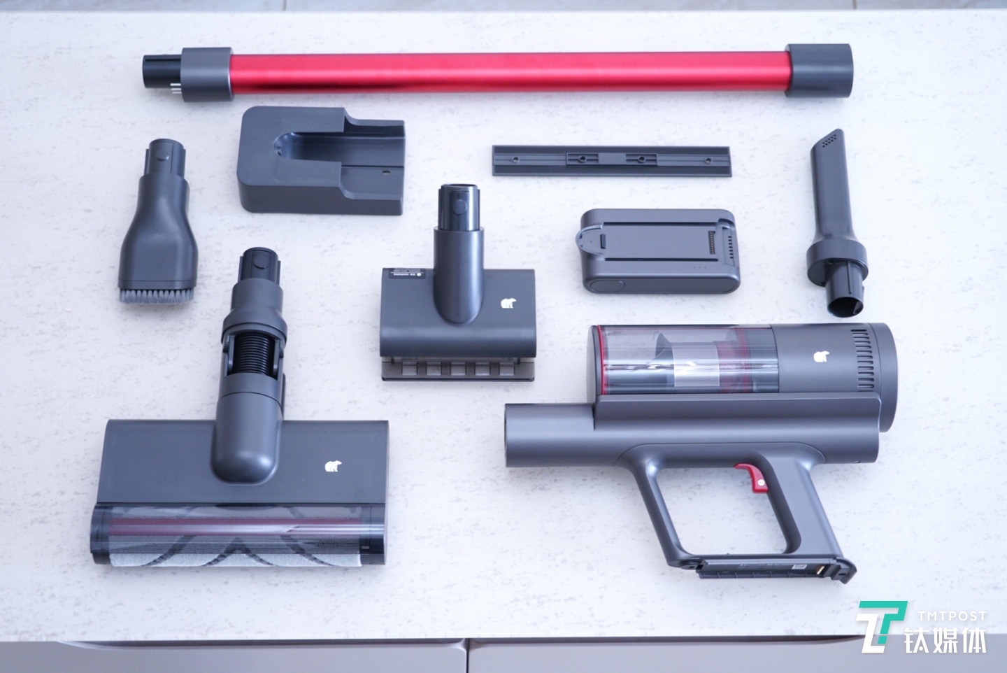 钛媒体拿到的这款Z11 Pro无线吸尘器采用灰色的极简风格设计,采用波尔多红酒酒瓶式设计,而灰色在欧式家装环境中是代表着高端,一方面显得非常有质感,另一方面能很好融入家居场景。