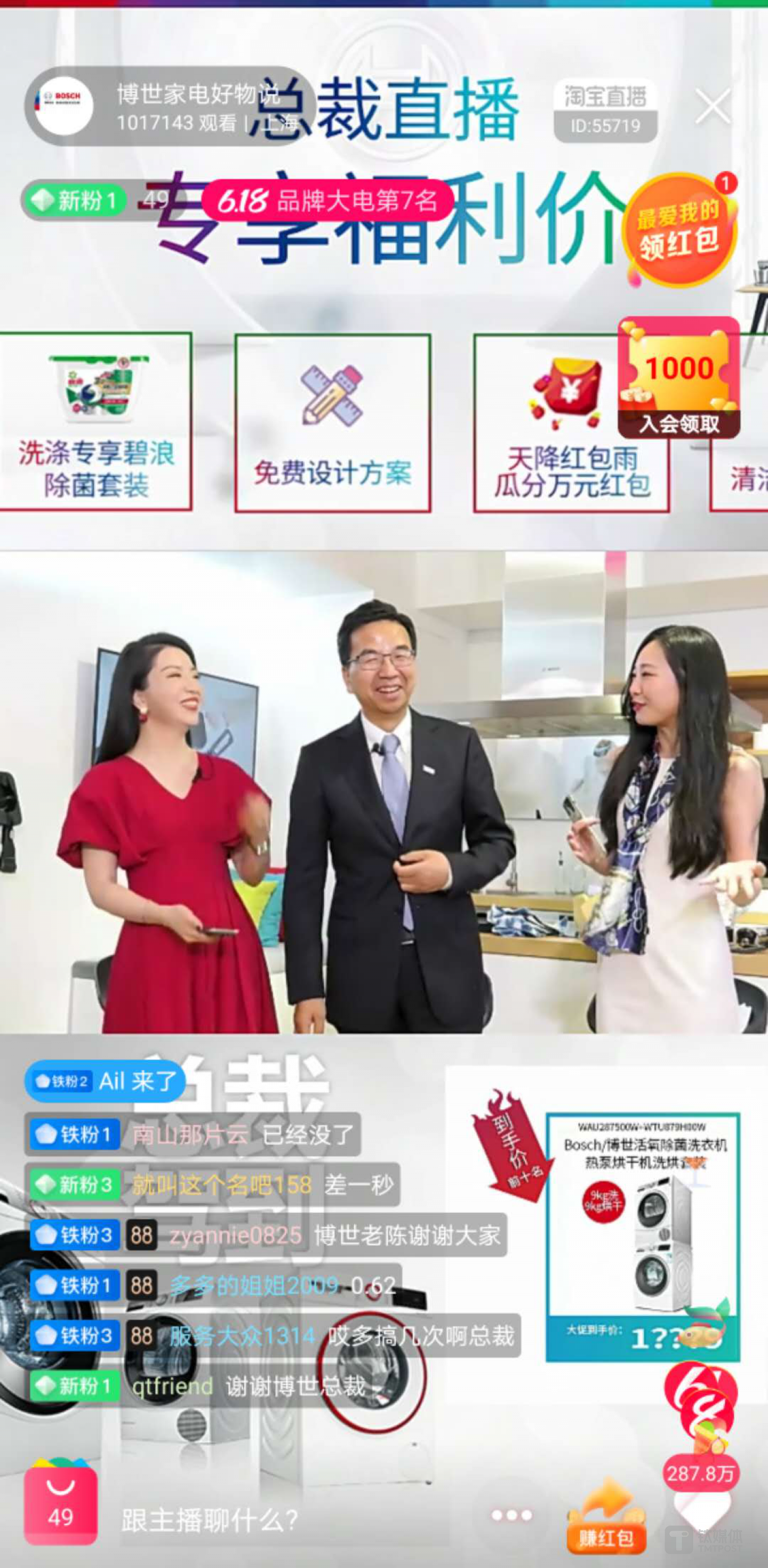 这次直播中,还有两位女主播与陈玉东搭档,在陈玉东进入直播间之后,刚开始的直播并不太顺畅,两位女直播一直讲个不停,一直插不上话的陈玉东,让很多粉丝很着急,不过,到后来整个直播越来越顺畅,尤其是陈玉东在讲解自家产品时,整个直播间很快嗨了起来,粉丝纷纷刷屏留言,“博世中国总裁接地气”。