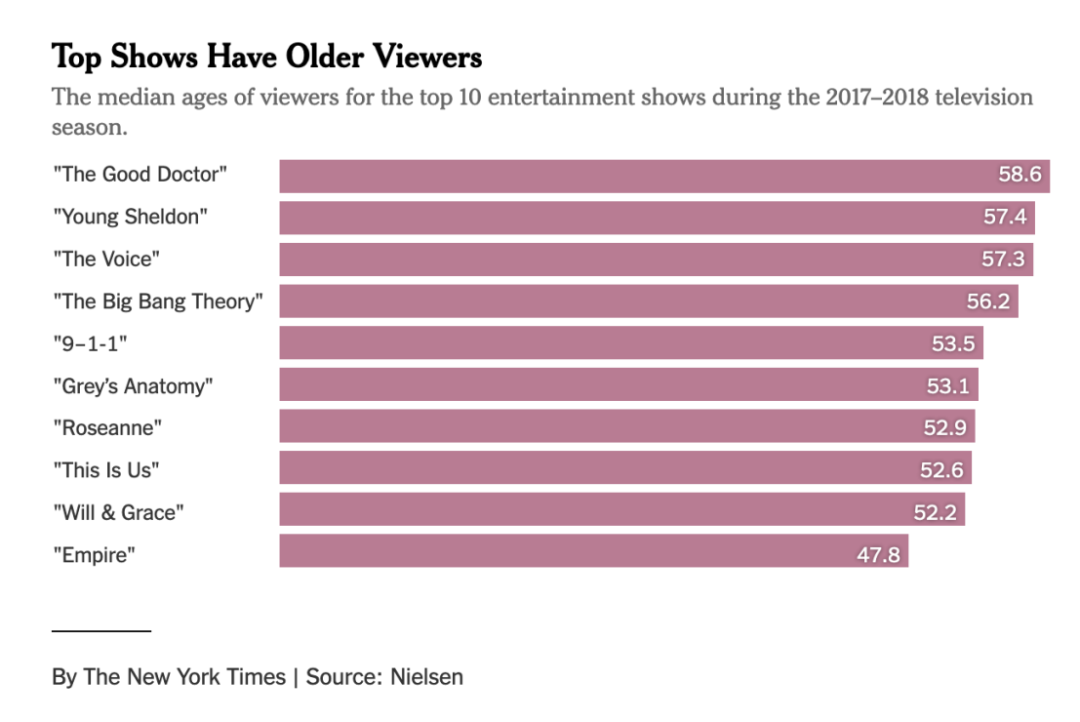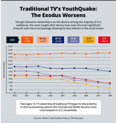 时至2018年,70%的青少年视频消费已经不再由传统电视提供。根据2018年7月的尼尔森报告,比起五年前,青少年观看传统电视的时间足足减少了49%。电视的热门剧集总是吸引着年龄更大的观众——