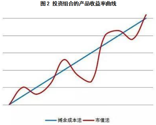 两种估值方式,摊余成本法波动小,但不能真实反映市价波动;市价法真实反映投资组合的市价,但波动大,反应在理财产品的收益率曲线上,便如下图2所示。