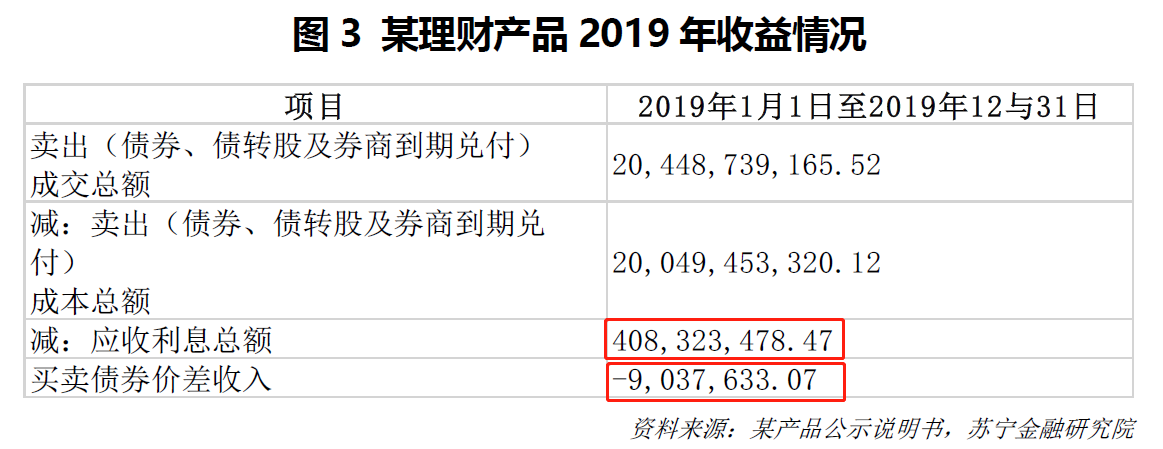 该理财产品在2019年全年共分配给投资者收益4.08亿,其中,仅有903万的收益来自于买卖债券的价差,占比仅为2%左右,其他则是依靠债券利息取得。