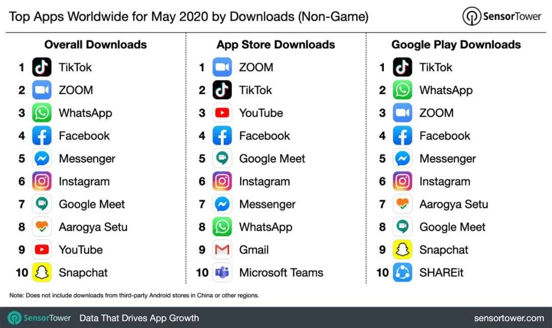 SensorTower数据显示,今年5月份,不论是下载量还是总收入,TikTok都包揽了全球App榜单第一。