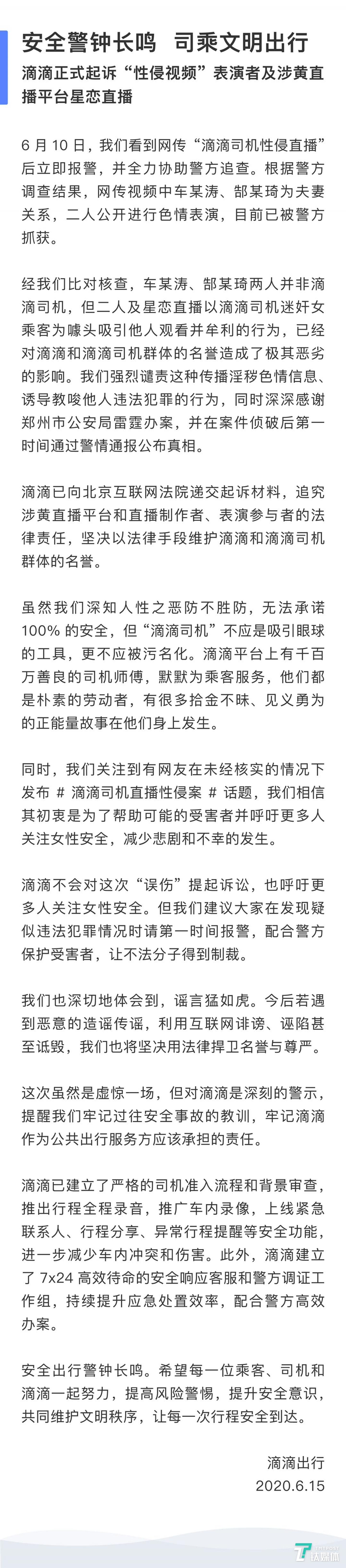 钛媒体快讯 | 6月15日消息:滴滴出行发布官方声明称,就“直播性侵”一事,向北京互联网法院递交起诉材料,追究涉黄直播平台和直播制作者、表演参与者的法律责任,坚决以法律手段维护滴滴和滴滴司机群体的名誉。
