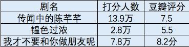 对比这三部影视剧当下的豆瓣打分人数,可以发现:《陈芊芊》13.9万人的评分人数排在最后,但若从剧集体量、演员知名度、播出渠道来看,《陈芊芊》当前所取得的近14万打分人数,已经属于“破圈”迹象。同期在播的口碑评价还不错的网络剧《韫色过浓》《我才不要和你做朋友呢》等多部网络剧,在豆瓣上的打分人数不过几万。