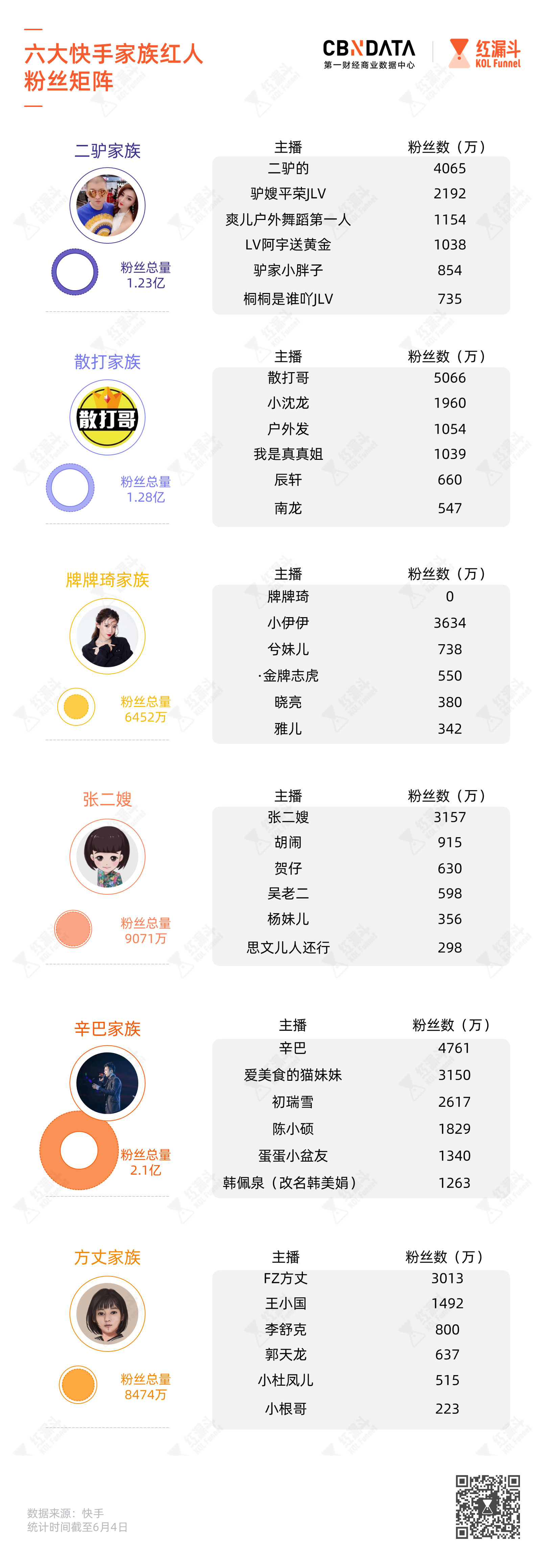 目前公认的说法是,快手有6大家族,分别是辛巴的818家族,散打哥的散打家族(早前以打山道成名)、方丈的丈门家族、张二嫂的嫂家军、二驴的驴家班,以及牌牌琦(全网被封)的716家族。