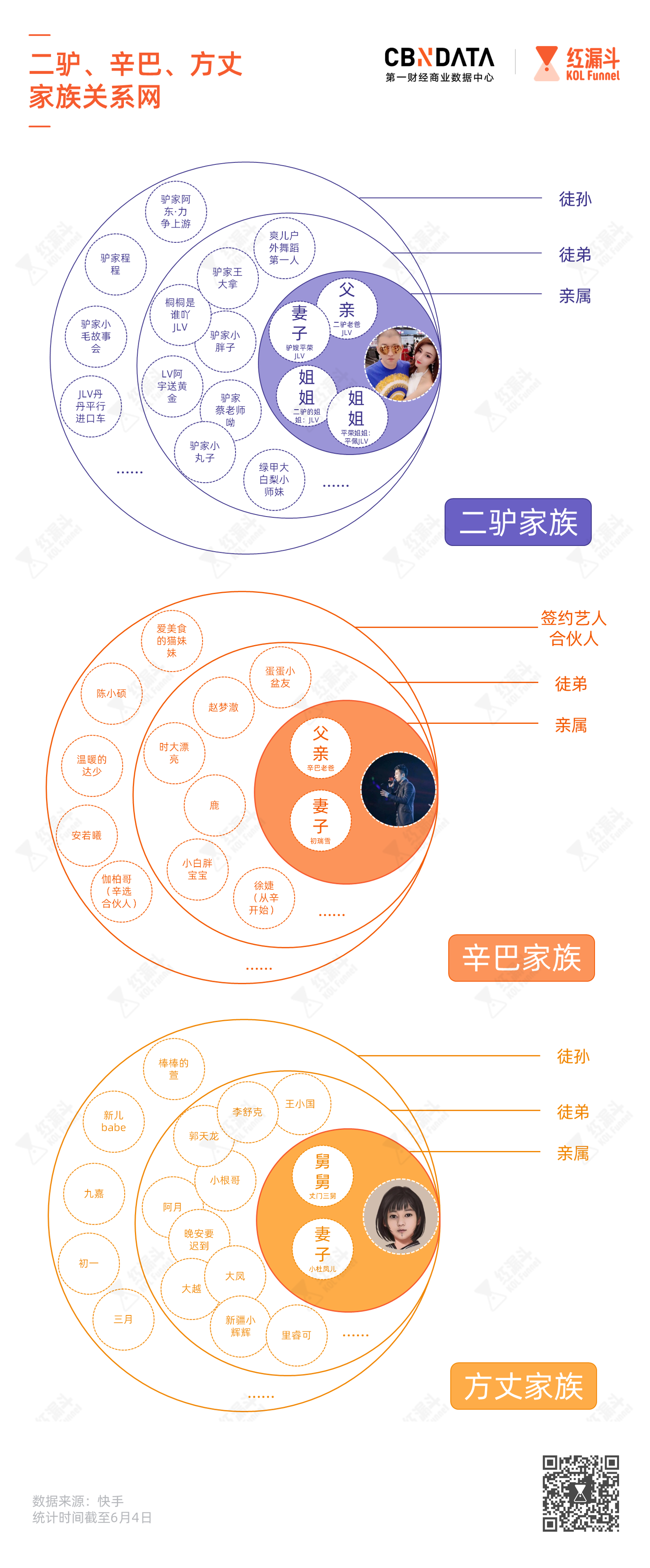 圆心通常是这个家族的核心主播,往往以夫妻档/情侣档共同经营事业,比如辛巴与初瑞雪夫妻,二驴与平荣夫妻。他们有血缘关系的家人也会开通账号,加入快手主播大军。再往外一圈,就是头部主播收的徒弟、签约艺人主播,最外围则是徒弟们再收的徒弟,也就是徒孙。