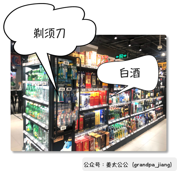 烈性酒的货架旁放着男士剃须刀。购买烈性酒不仅仅表示消费者对酒感兴趣,也表示这个购买者是男性或者为男性而购买