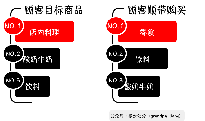 在7-11便利店里,餐饮品类一定程度上带动了其他品类的销售增长。顾客的目标商品的 Top 3是店内料理,牛奶,饮料。这些商品是消费者进入便利店的驱动力。但是,没有完,消费者还买了很多他们进店前没有想买的商品,比如零食。