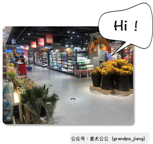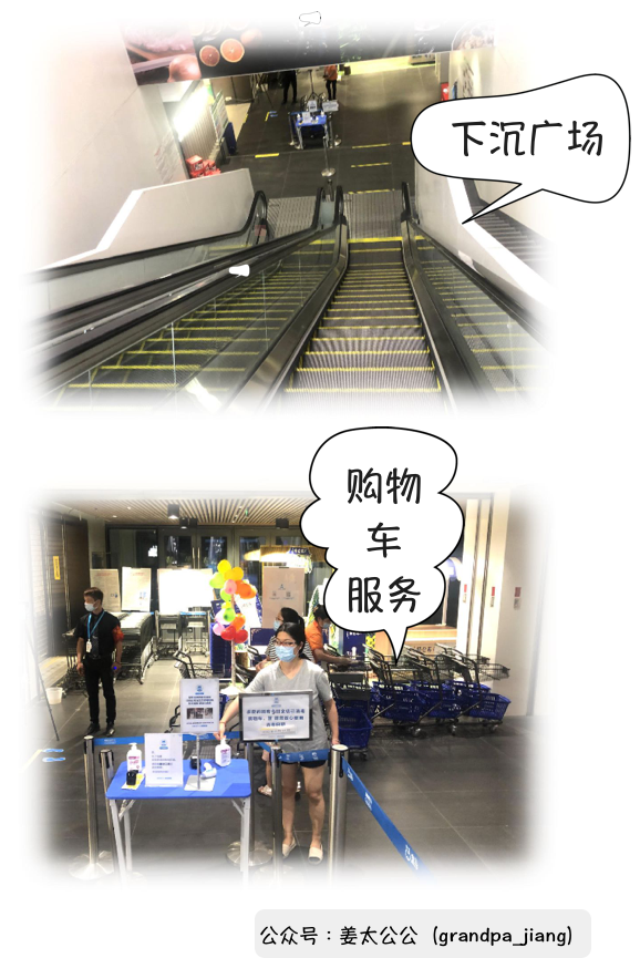 姜太公公逛的这家盒马采取了如下方式进行缓冲。首先,盒马选址在下沉广场,消费者需要通过扶梯进入,这天然就有一段物理冷静时间。其次,提供服务。设置专门的服务人员在门口询问是否需要购物筐。表面上是提供服务,实际上是提醒消费者要购物了,快醒醒。