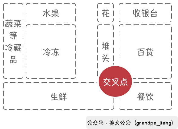 在姜太公公逛的这家盒马里,这个交叉点承载着最重的服务设计,用服务来拦截消费者,促进人流的付费转化。交叉点里有日日鲜的鲜奶员工在推销、有雀巢樱花咖啡的堆头展示、有折扣区的促销、有自营品牌的介绍。盒马其余地方的购物是无打扰的,工作人员都是在分拣理货。而在交叉点里,服务人员非常多,非常吵。我在模模糊糊的情况下,购物车上就多了一盒14块钱的酸奶和一袋12块钱的面包。