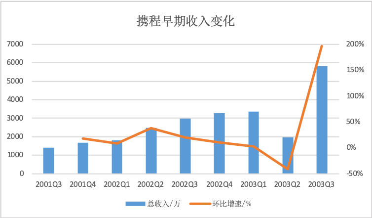 幸运的是SARS危机很快便被解除,而走出冲击的携程也迎来了双重利好。首先是业务在当年Q3强势反弹,总营收环比增长196%至5800万,老虎基金的1000万美元融资则从资本市场送来暖意。