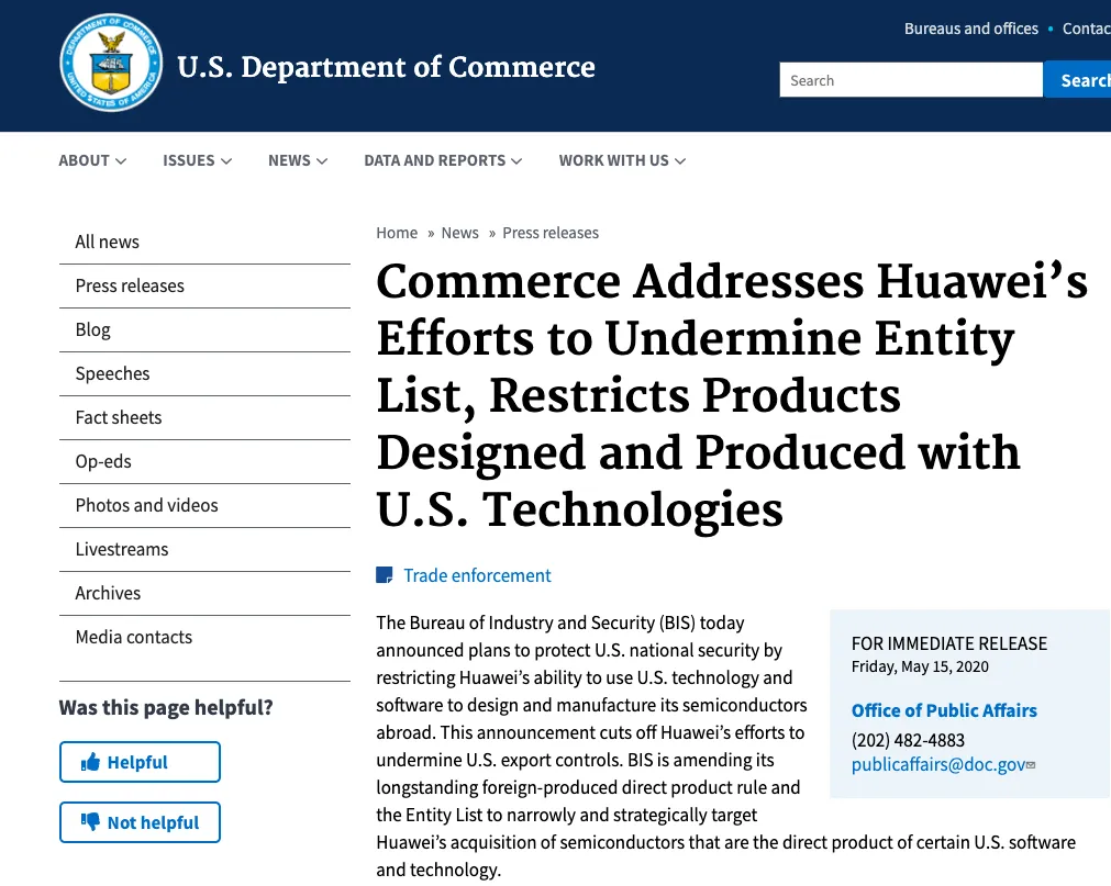美国商务部的任何举动,都是以美国利益为优先,这也是它们的基本立场,这一点从其官网新闻的标题就略见一斑——《商务部为美国公司更充分地参与技术标准制定机构扫清了道路》。