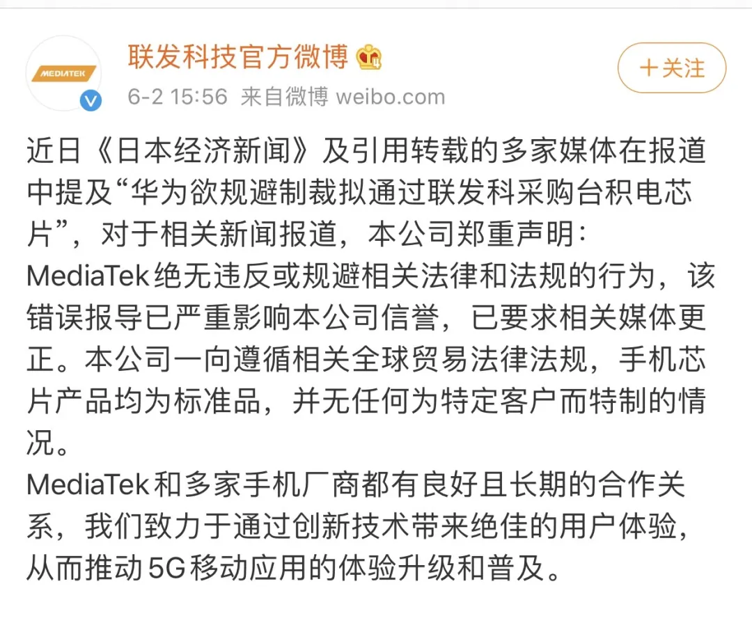联发科也曾被视为华为的备选,不过联发科随即表示这种事不存在的,考虑到联发科曾积极响应对华为的制裁,也的确不现实。