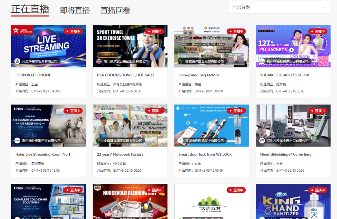 官网上最清晰醒目的除了16大类50个展区的分类显示,就是展商直播大厅。笔者在下午15点进场时,显示正有7358个直播正在进行。