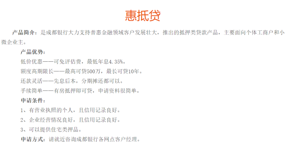 除针对于个人的信用贷款价格下降外,消金界发现,股份行成都银行一款主要面向个体工商户和小微企业主的经营贷产品惠抵贷,其年化利率也仅在4.35%。