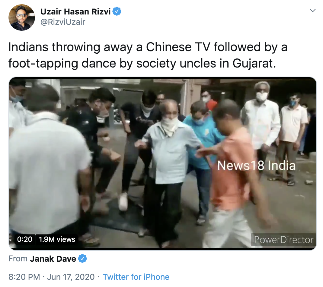 6月17日,推特用户Uzair Hasan Rizvi上传了一段视频,在这段打上“News18 印度”水印的视频中,一些人从古吉拉特邦苏拉特的一栋高楼里,扔下一台中国制造的电视机,人们踩在电视机上跳舞,再将其拆除。